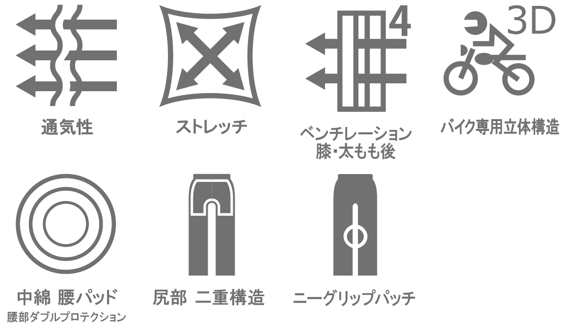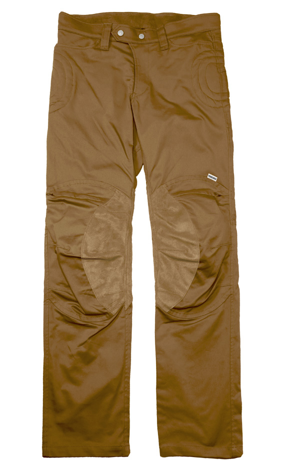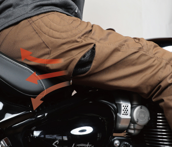 脚が大きく開き、動きやすい バイク専用立体構造。こだわり抜いたオリジナルのカッティングで裾がずり上がらず、ウエストがずり下がらない